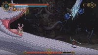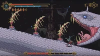 This boss is an extremely long snake of colossal size, so long in fact that its body is part of the background of its own bossfight scenario, surrounding an enormous tower composed of broken, old ships.