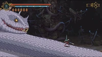 •Fang Charge: Sierpes emits a powerful roar sending sound waves across the screen and the proceeding after a few seconds to charge at the player with high speeds.It is most likely guaranteed that this is his first attack at the start of the boss fight.To simply avoid this,run to the opposite side and stay there until it is finished.During the retreat period its tongue is visible allowing for extra damage.